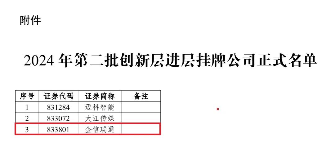 2024年4月18日,北京金信瑞通科技股份有限公司(股票簡(jiǎn)稱:金信瑞通,股票代碼:833801 )躍然列入創(chuàng)新層,高質(zhì)量進(jìn)入上市沖刺期。